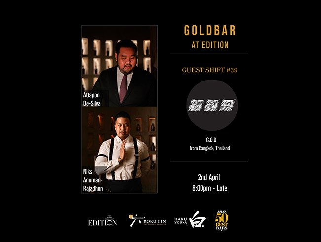 バー業界で最も影響力のある人物を選出する「Bar World 100」にも名を連ねるNiks氏は、「過剰こそ必要」という哲学を掲げ、その世界観をGold Barで表現します。さらにYolo Groupのビバレッジディレクターであり、「Bangkok Bar Show」のパートナーでもあるAttapon氏が加わり、卓越した技術とホスピタリティで、この特別な一夜を彩ります。