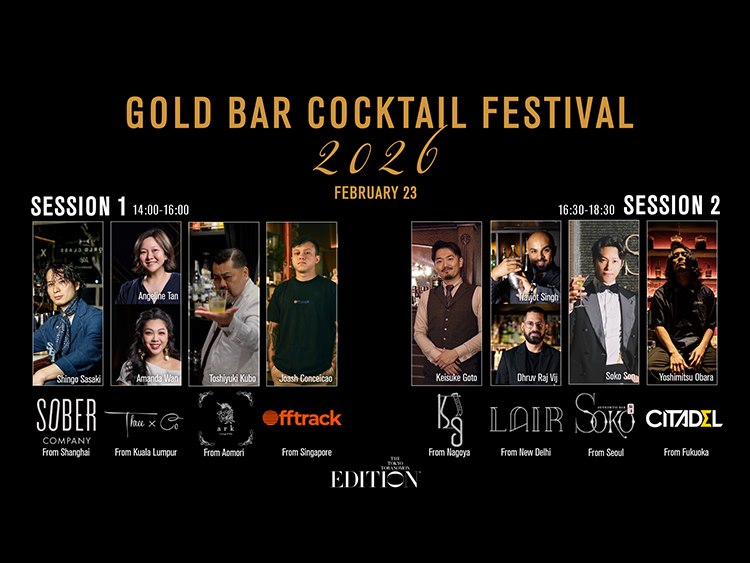 2026年2月23日に、トップバーテンダーのカクテルを一堂に楽しめるイベント「GOLD BAR COCKTAIL FESTIVAL」を開催します。3回目となる今年は、世界8都市のバーから10名のトップバーテンダーを招聘。彼らの卓越した技術と感性を注ぎ込んだ16種類のシグネチャーカクテルをフリーフローでご提供します。各バーステーションを自由に巡りながら、ここでしか出会えないクリエーションと、それぞれのカクテルに込められたストーリーをお楽しみください。世界のバーカルチャーを体験できるこの機会にぜひご来場ください。